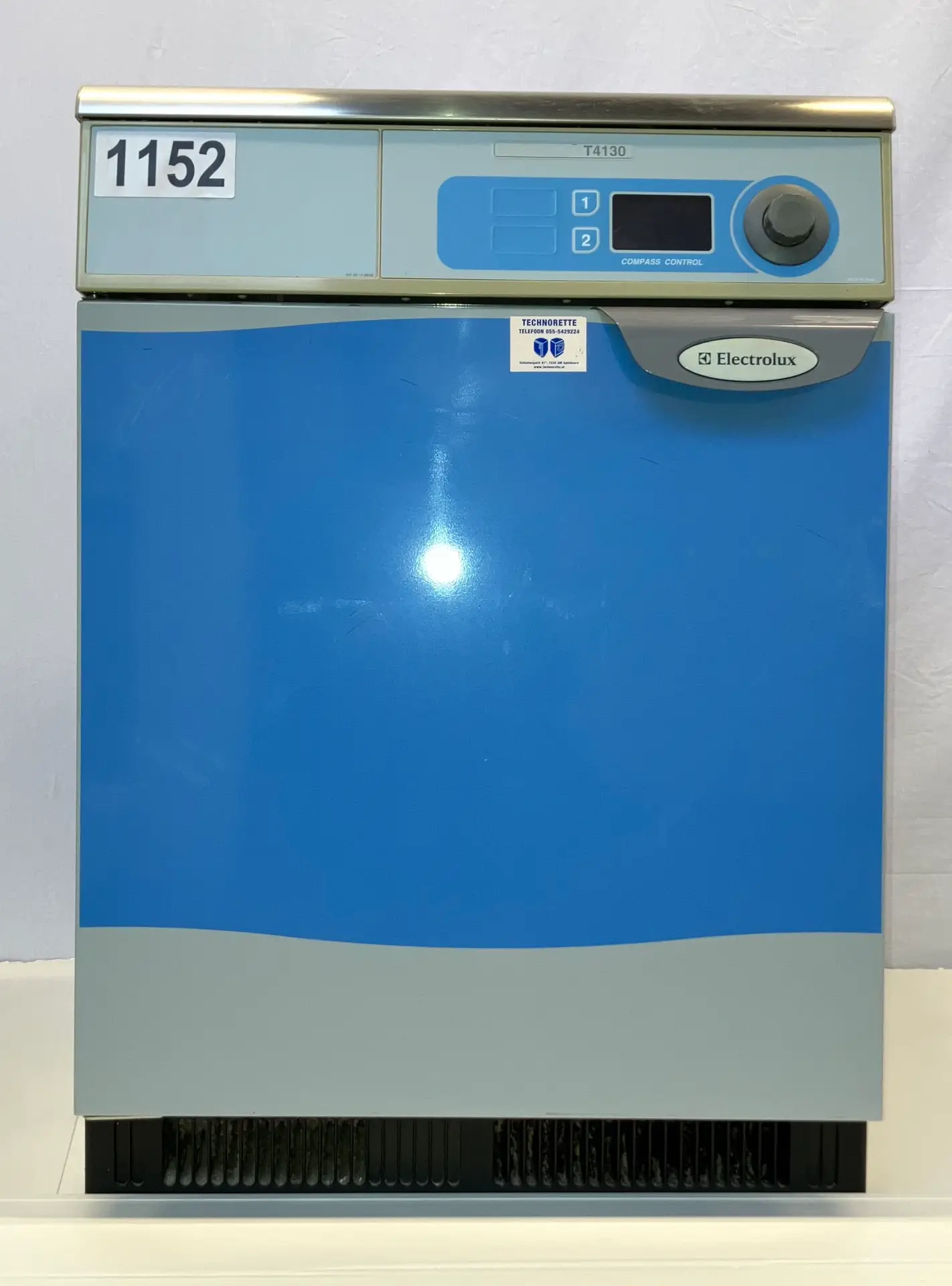 De Electrolux Professional T4130 refurbished is een professionele tumble dryer (luchtafvoer) met een capaciteit van 7,2 kg (vulfactor 1:18) en een trommelvolume van 130 liter. De machine is elektrisch verwarmd (5,1 kW), heeft Compass Control microprocessorbesturing met taalkeuze en groot display, en is uitgerust met Residual Moisture Control en een reverserende RVS-trommel. Geleverd als gereviseerde oplossing met 12 maanden garantie via Technorette.